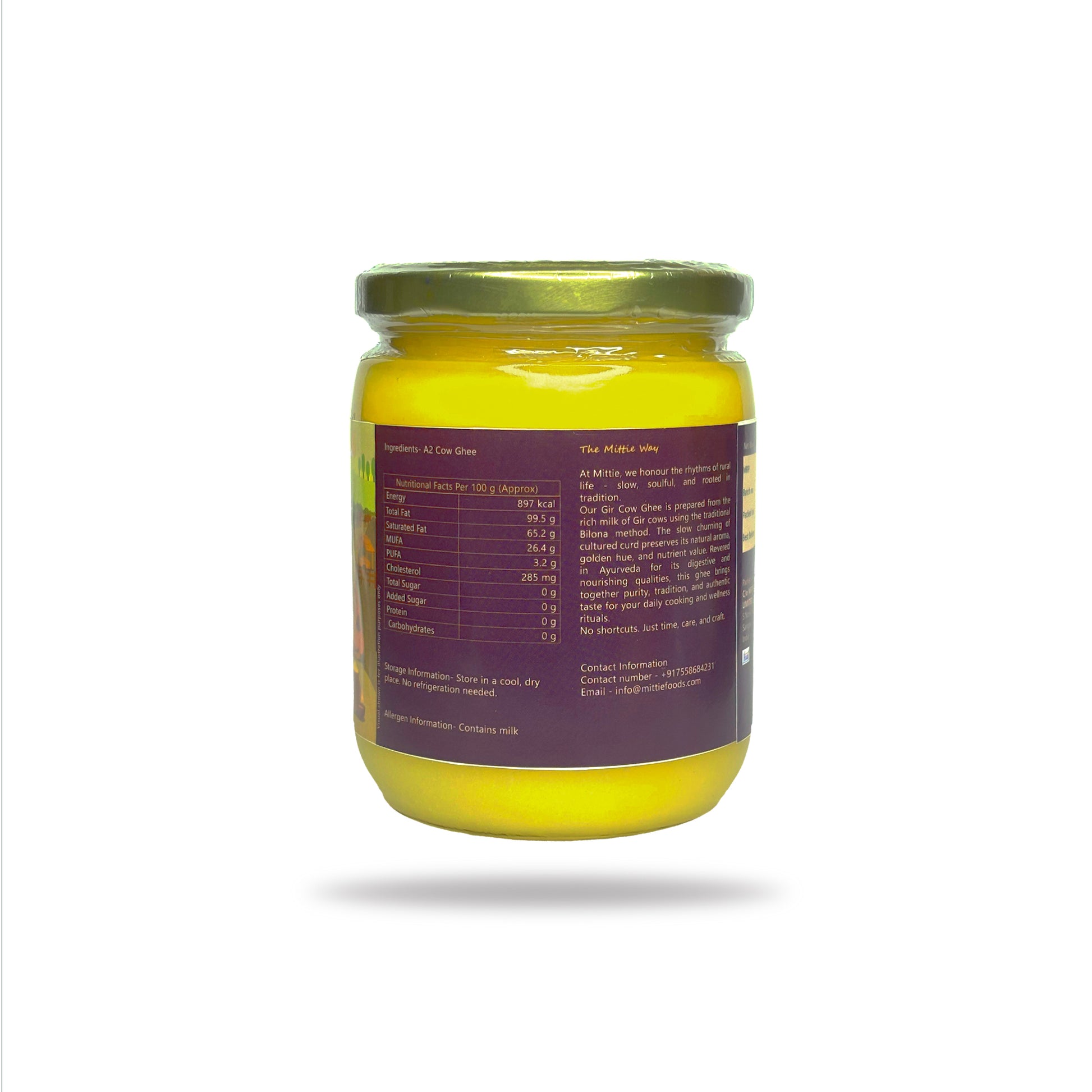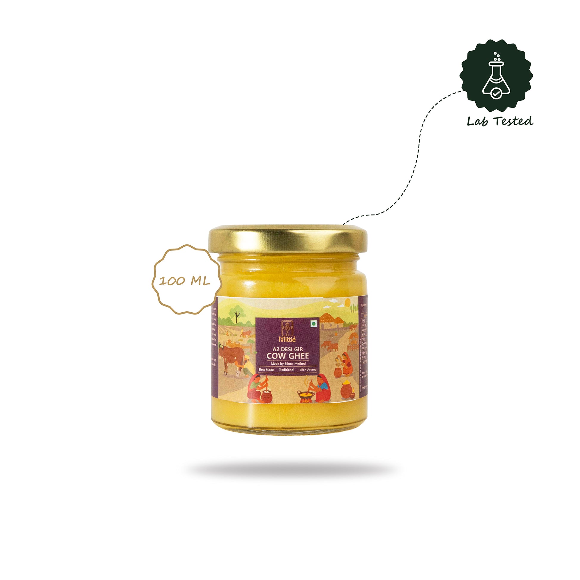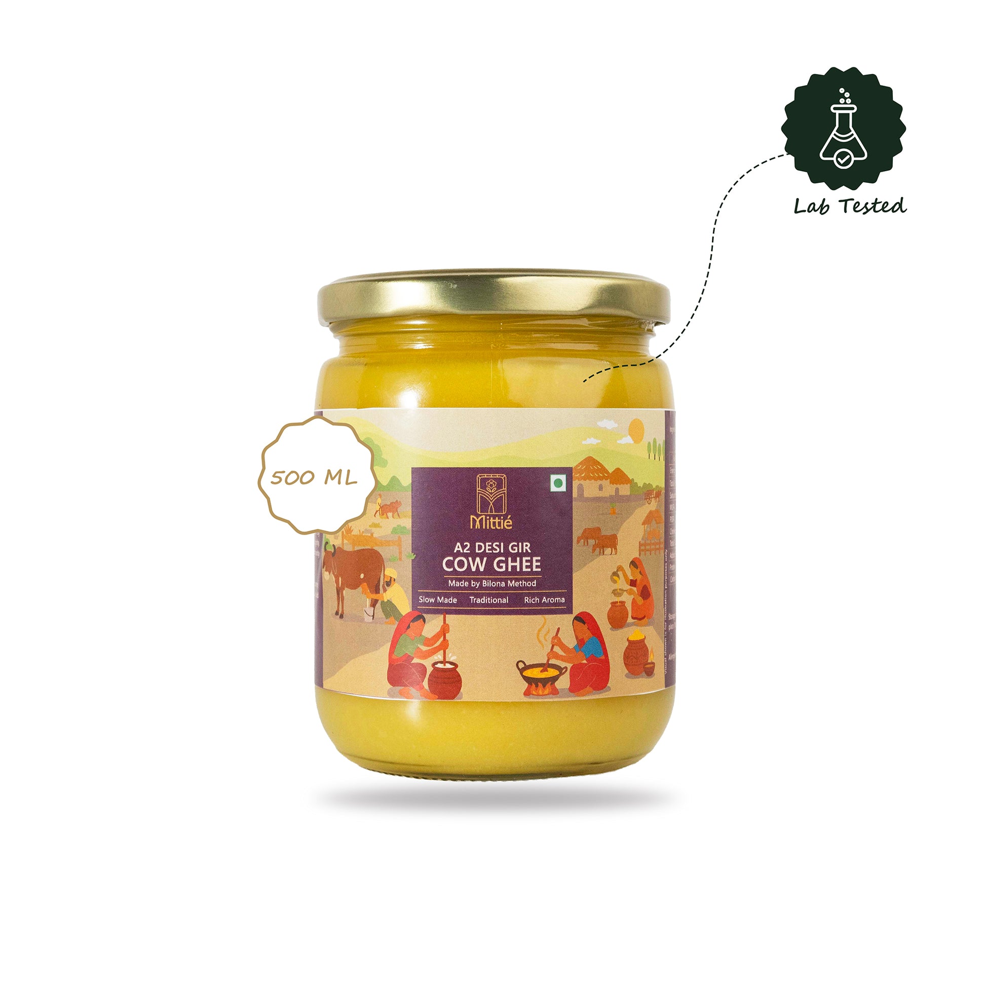 Born in Indian villages, made with care — this ghee carries the soul of our roots. Prepared in small batches from Gir cow milk, it brings authentic flavor and tradition to your kitchen. A natural source of healthy fats and essential vitamins, this ghee supports digestion, immunity, and overall vitality.
